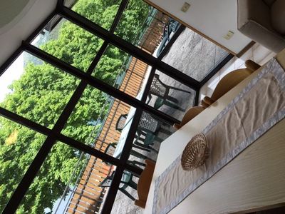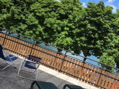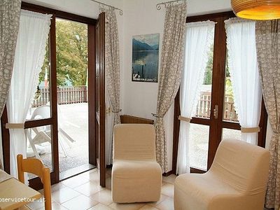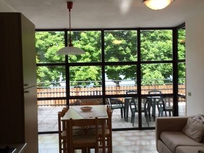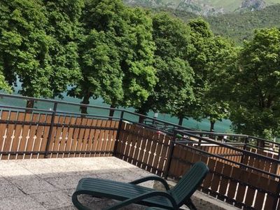 Fronte lago, 1°P ca. 65 mq - 1 stanza a due letti - 1 stanza matrimoniale - soggiorno con angolo cottura e divano letto doppio - Sat TV - bagno con vasca o doccia - terrazza da 60 a 80 M2 completamente privata e recintata con vista lago con mobili da giardino , phon, parcheggio privato.